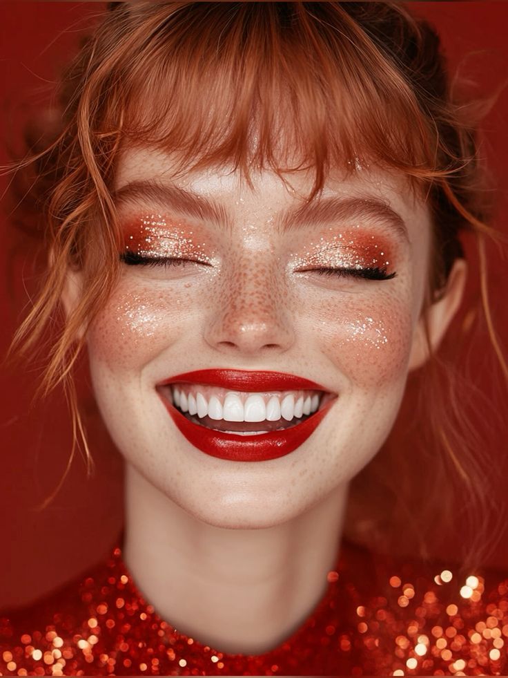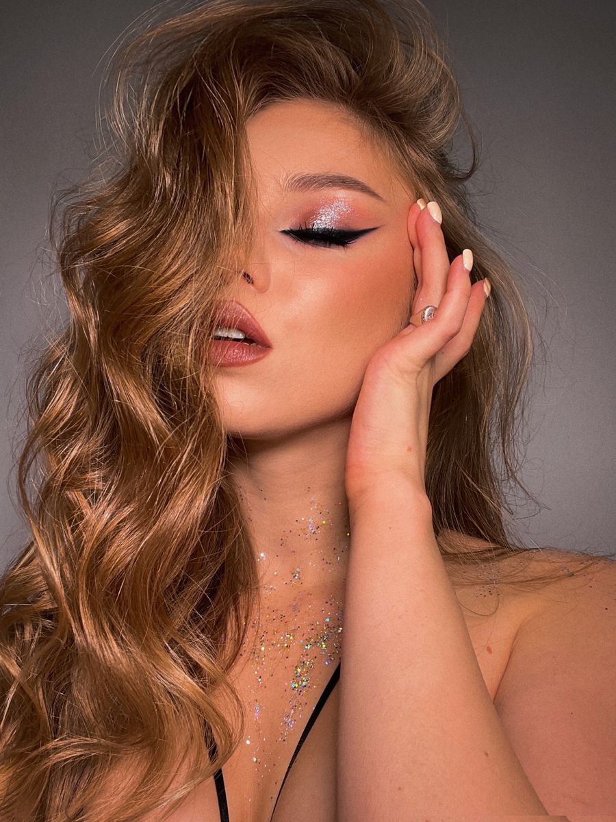 В новогодней фотосессии макияж может быть чуть более ярким, чем в повседневной жизни. Акцент на глазах с помощью мерцающих теней или стрелки, а также насыщенный цвет губ помогут лицу не потеряться в кадре. Для вечерней съемки уместны легкие шиммерные частички на скулах и в области ключицы.
